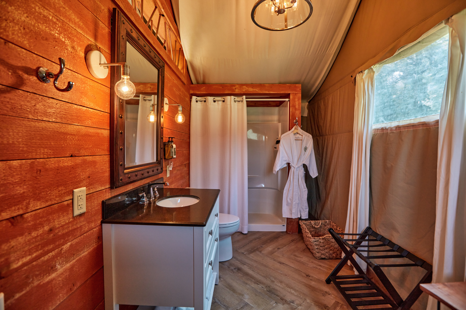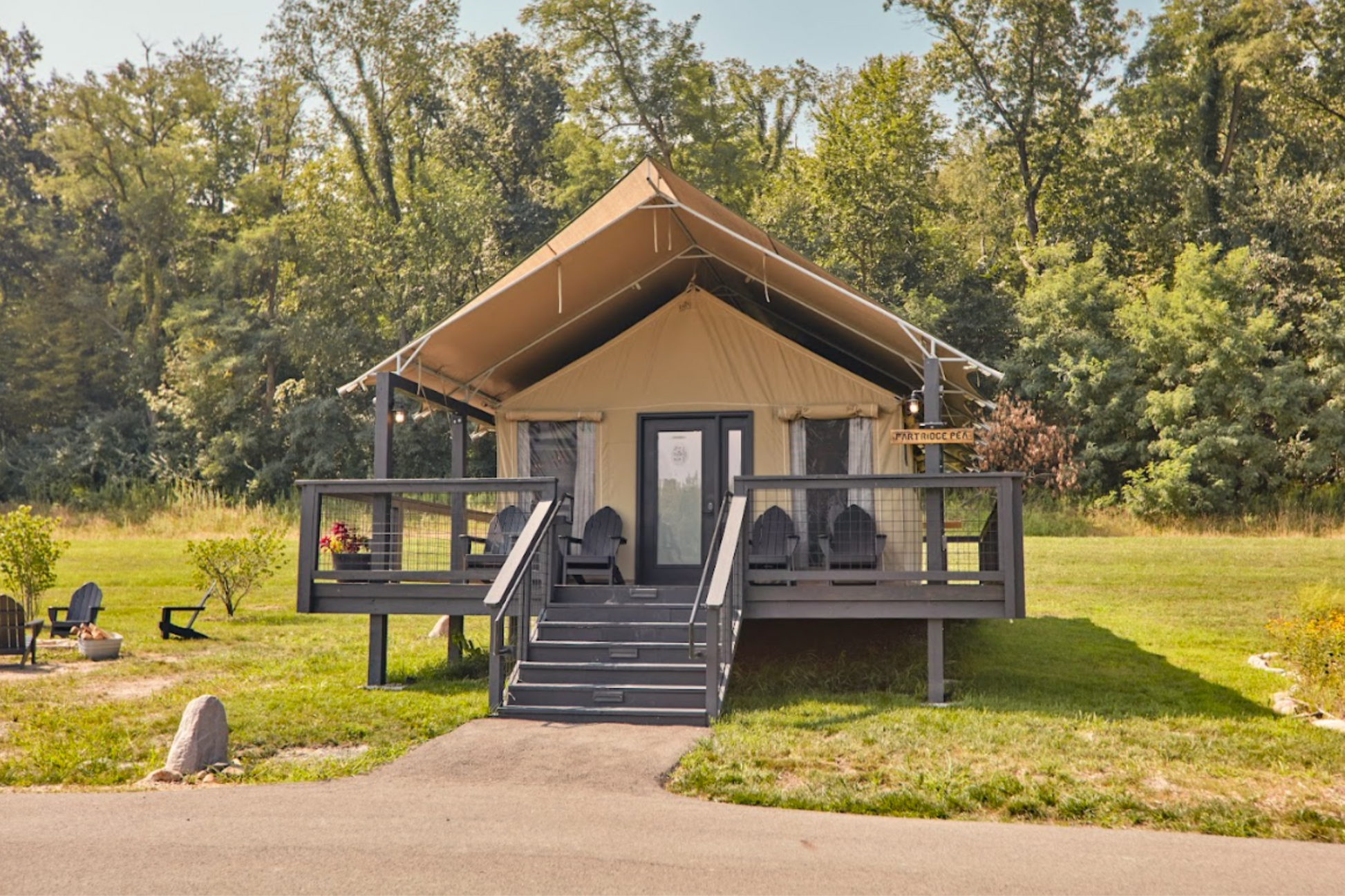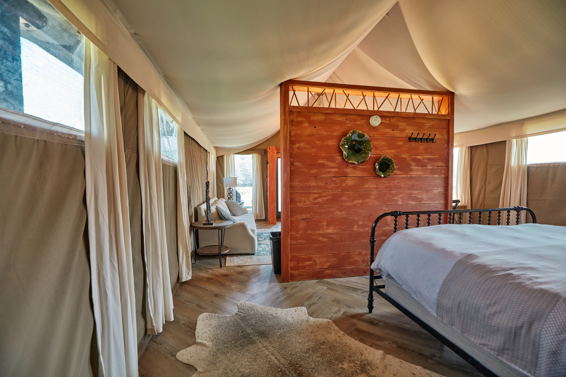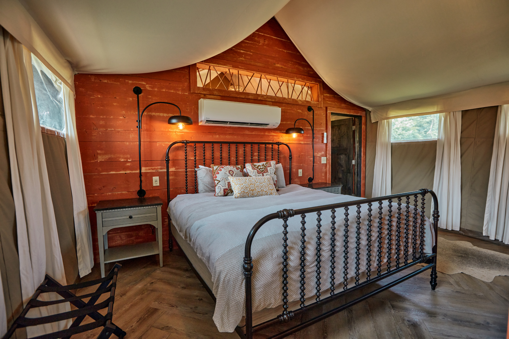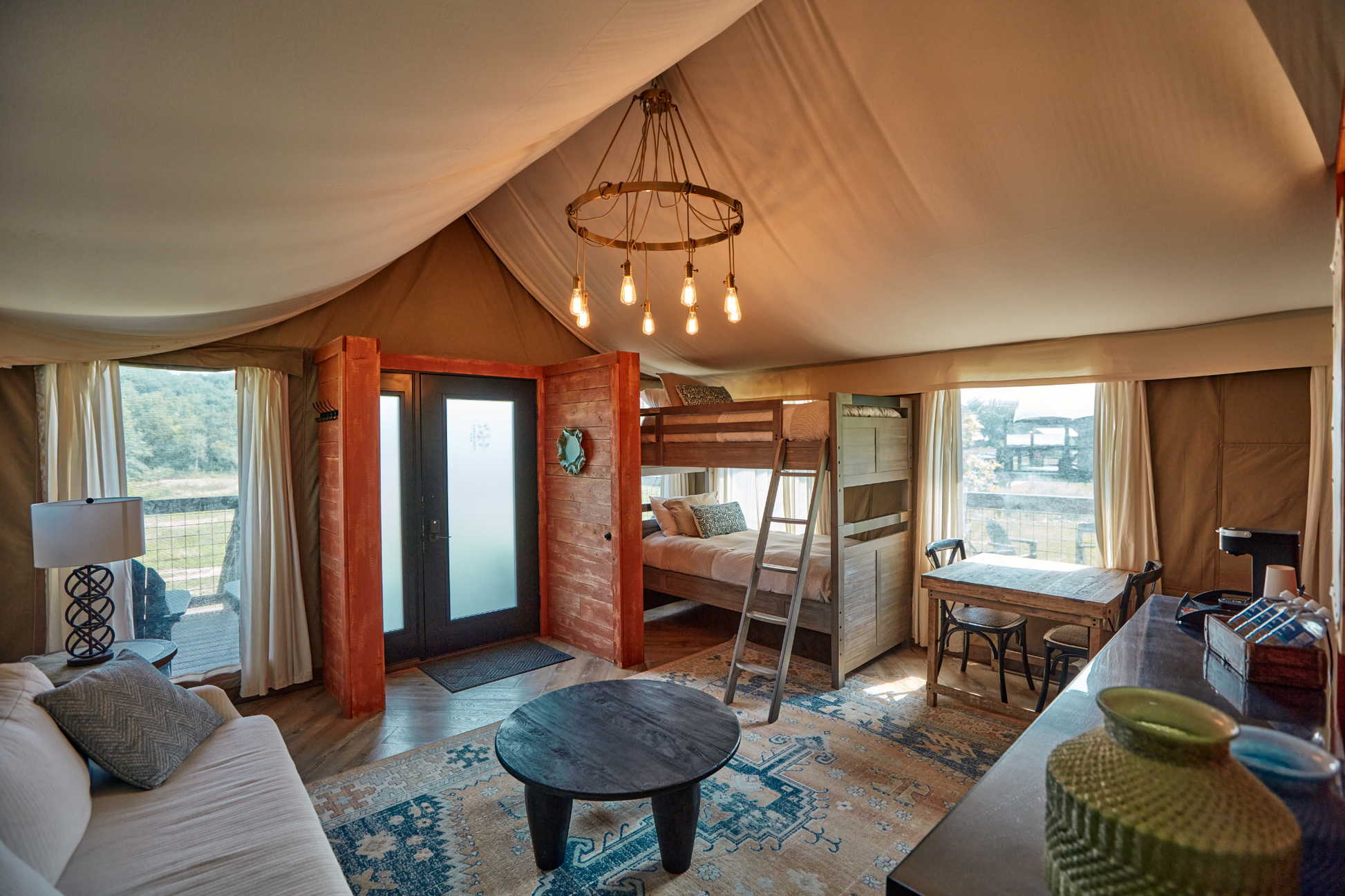 This tent is best suited for 4 people. It is furnished with one king bed, one queen sleeper sofa, and twin bunk beds. The king bed is sectioned off from the bunk and sofa area.