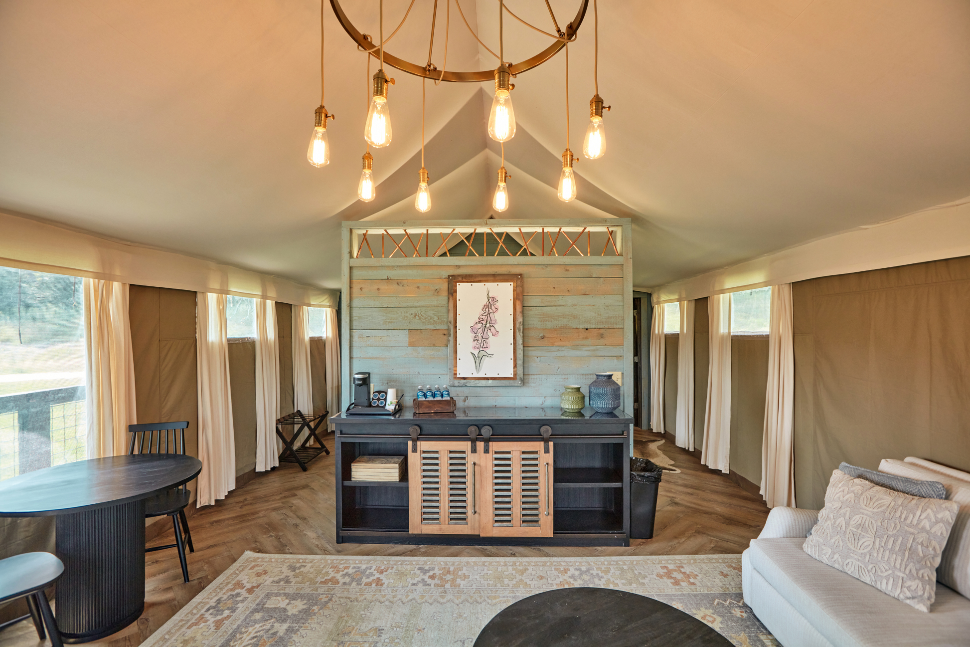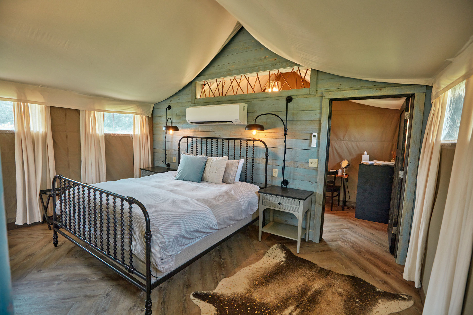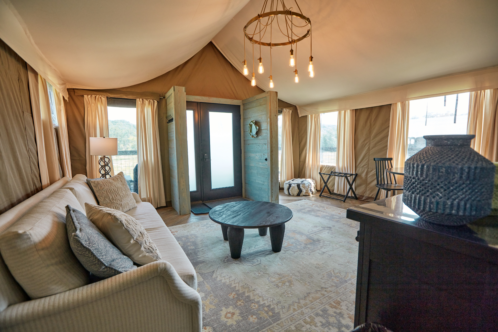 This tent is best suited for 2 people. It is furnished with one king bed and one queen sleeper sofa. The queen bed and sofa are sectioned off from one another.