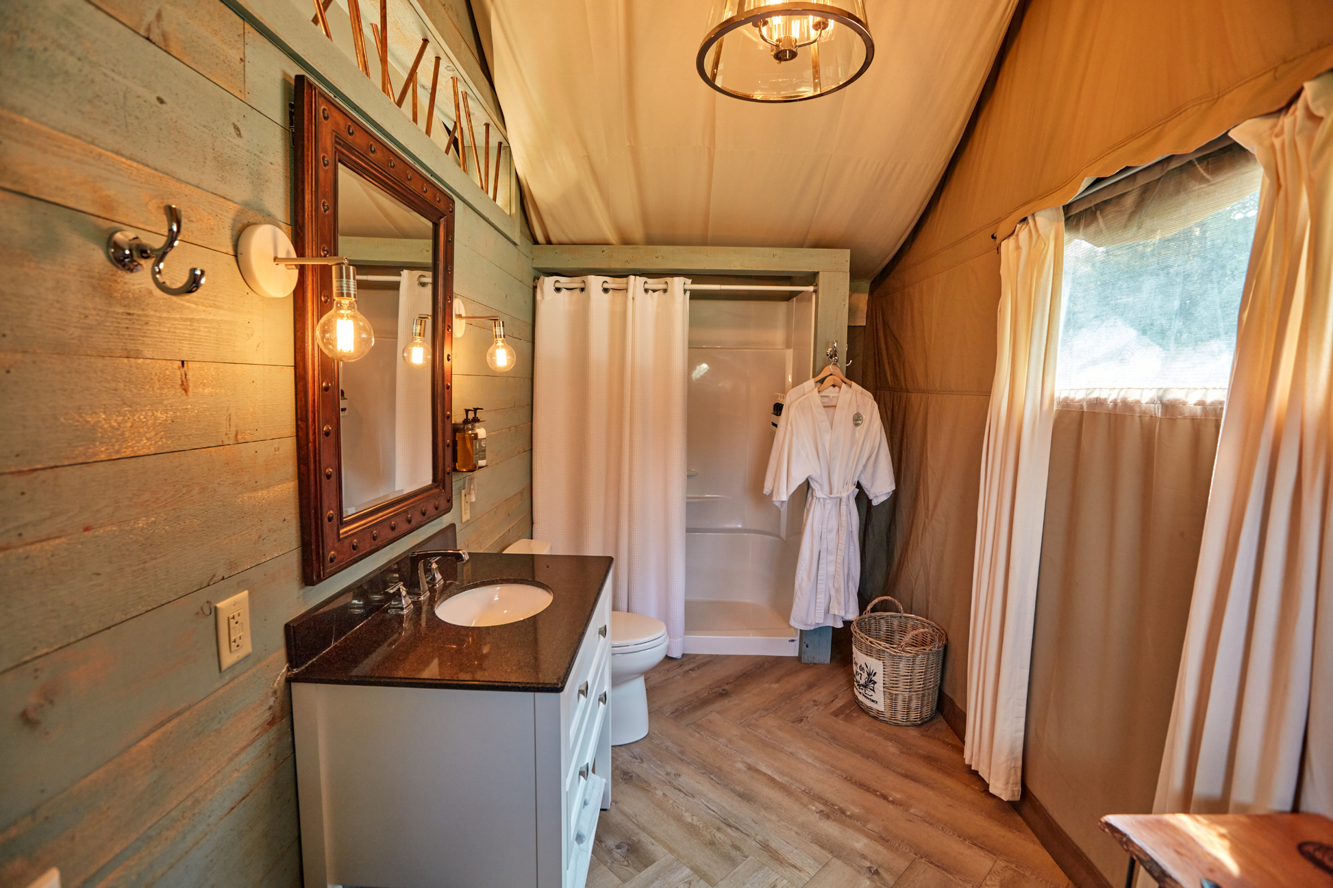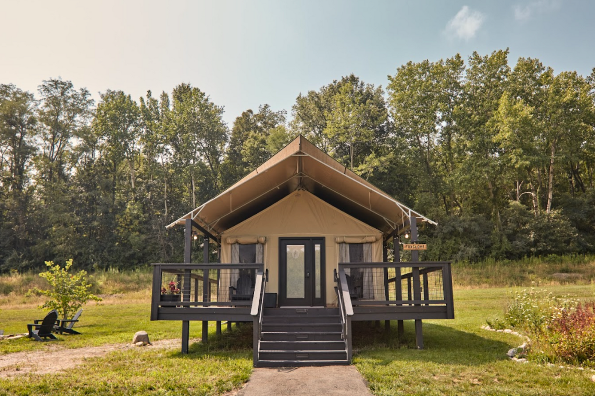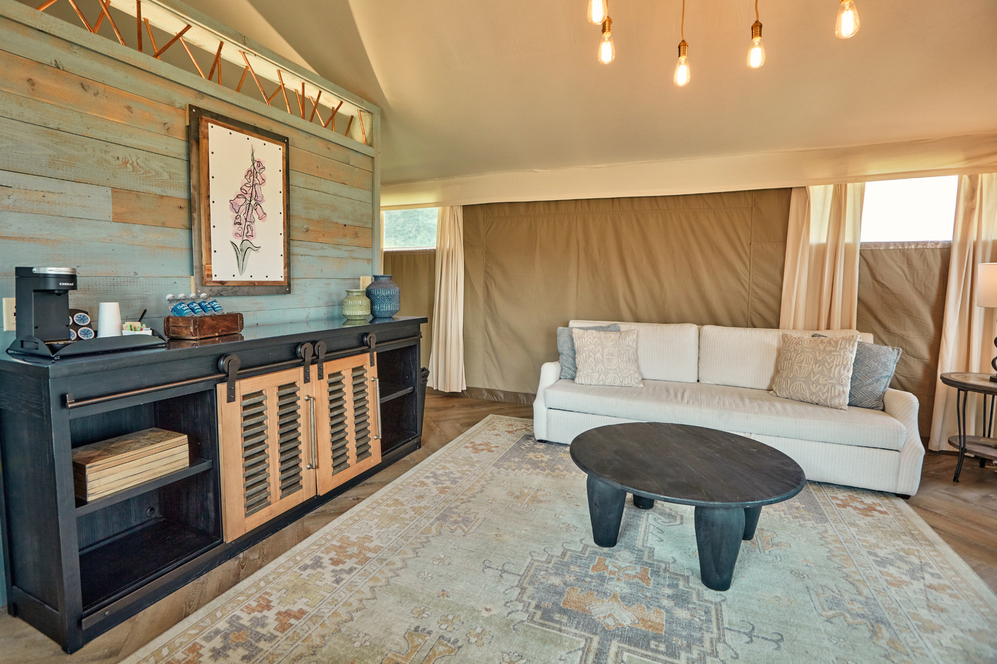 This tent is best suited for 2 people. It is furnished with one king bed and one queen sleeper sofa. The queen bed and sofa are sectioned off from one another.