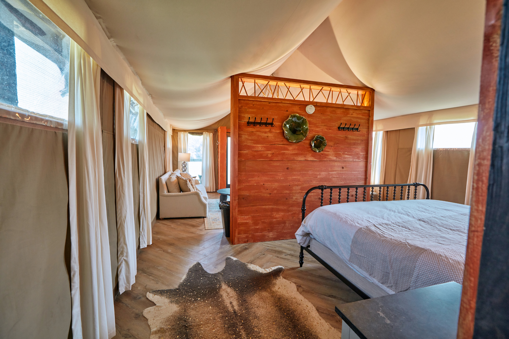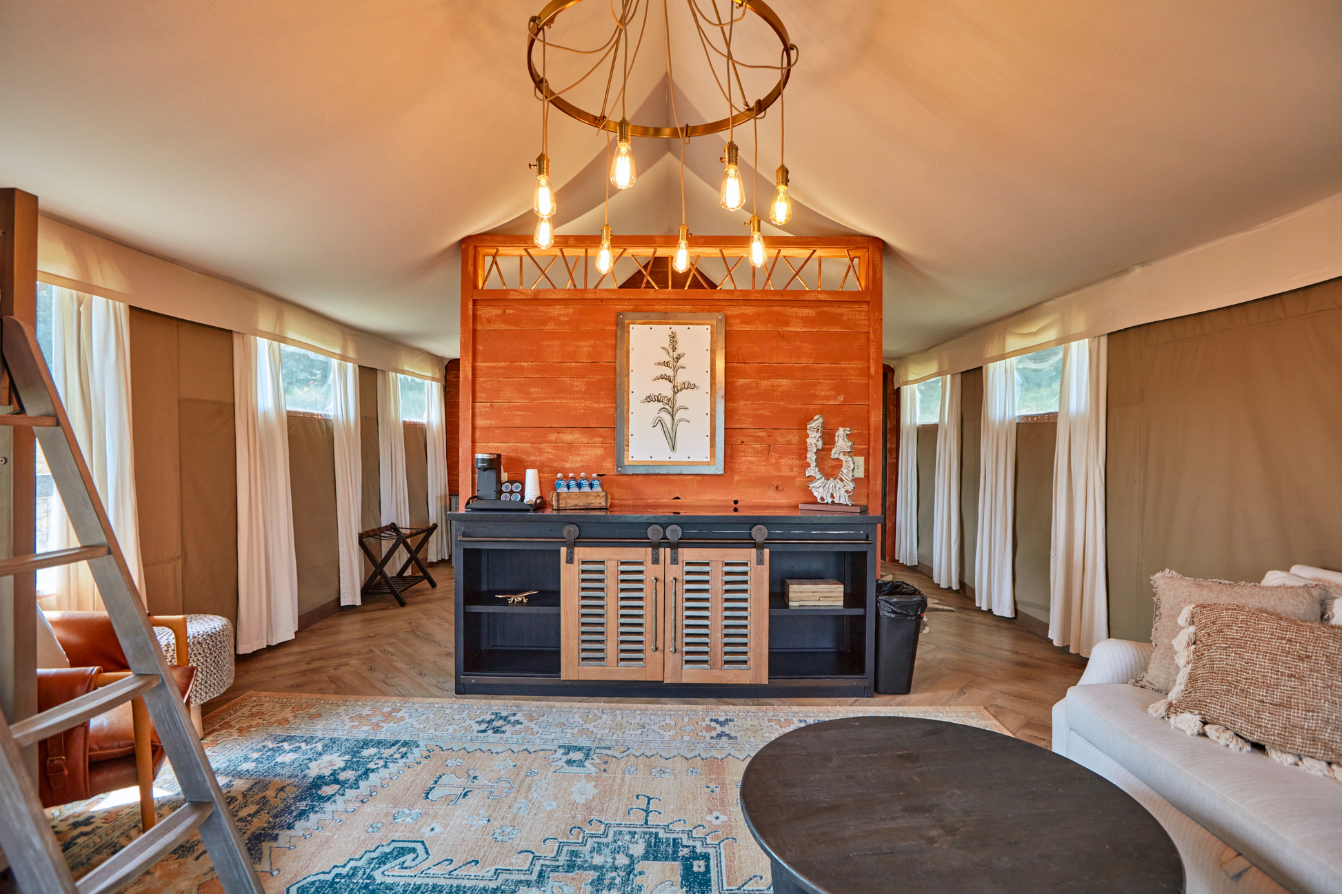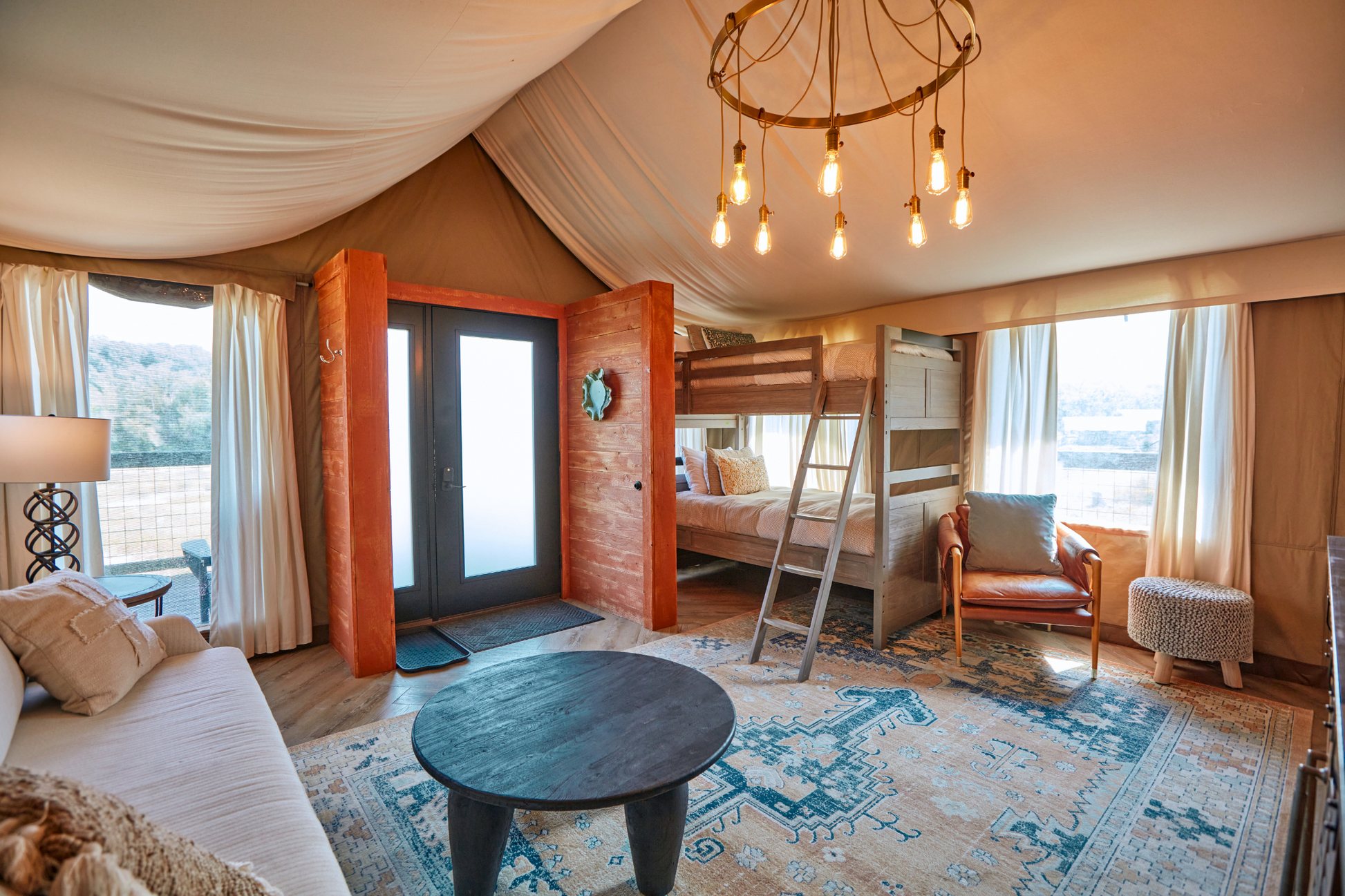 This tent is best suited for 4 people. It is furnished with one king bed, one queen sleeper sofa, and twin bunk beds. The king bed is sectioned off from the bunk and sofa area.