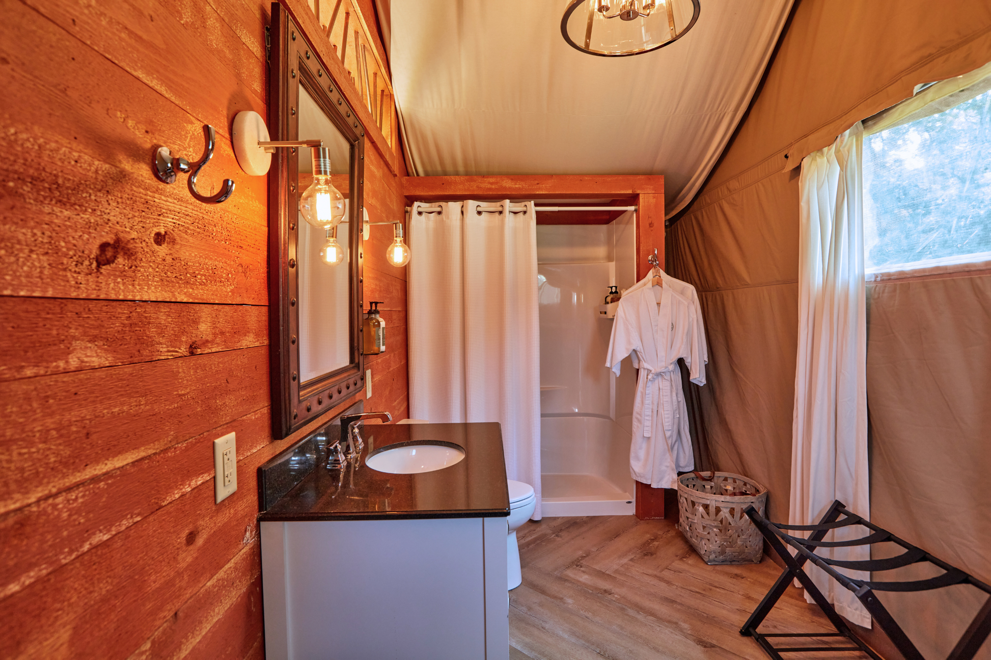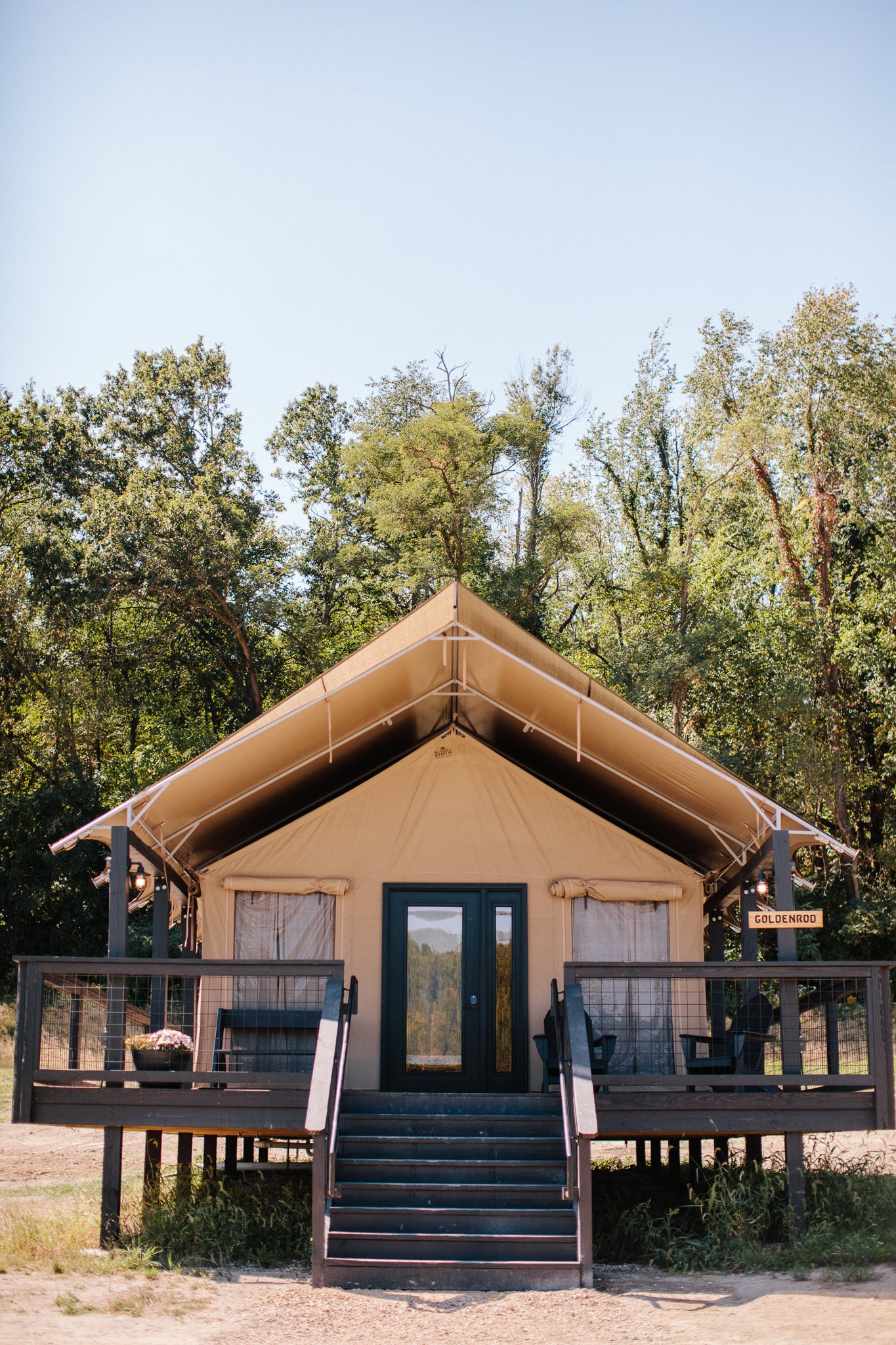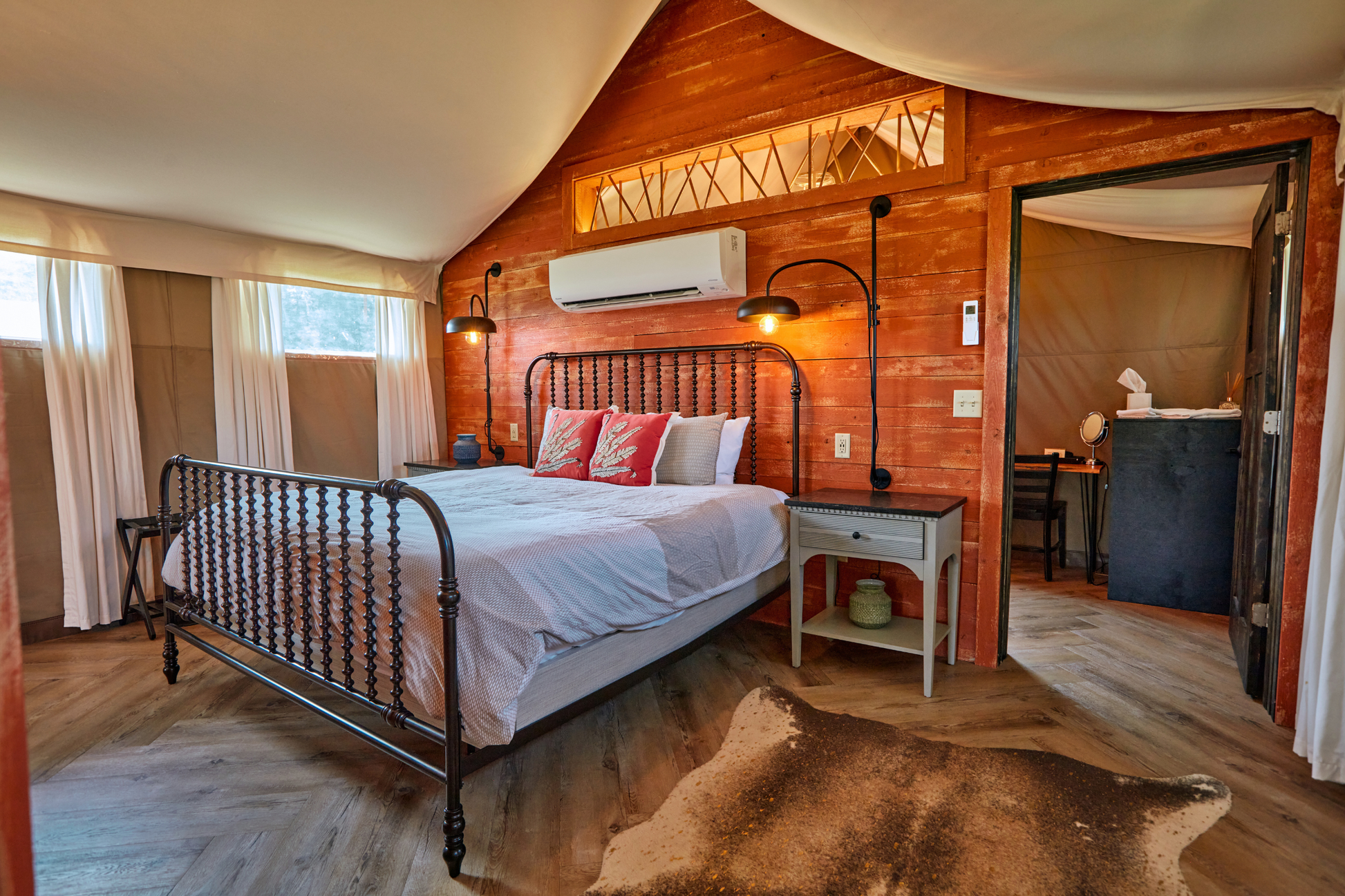 This tent is best suited for 4 people. It is furnished with one king bed, one queen sleeper sofa, and twin bunk beds. The king bed is sectioned off from the bunk and sofa area.