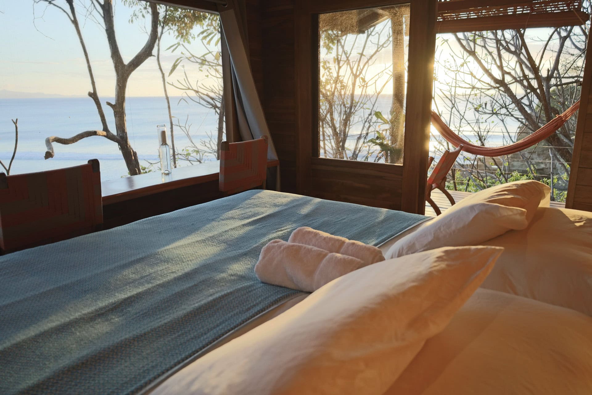 Our Cliffside cabins are perched over the beach with a stunning unobstructed view of the waves breaking and Costa Rica in the distance. A cozy space ideal for a solo traveler, the balcony is perfect to relax and take in the view. The view from bed also unparalleled.