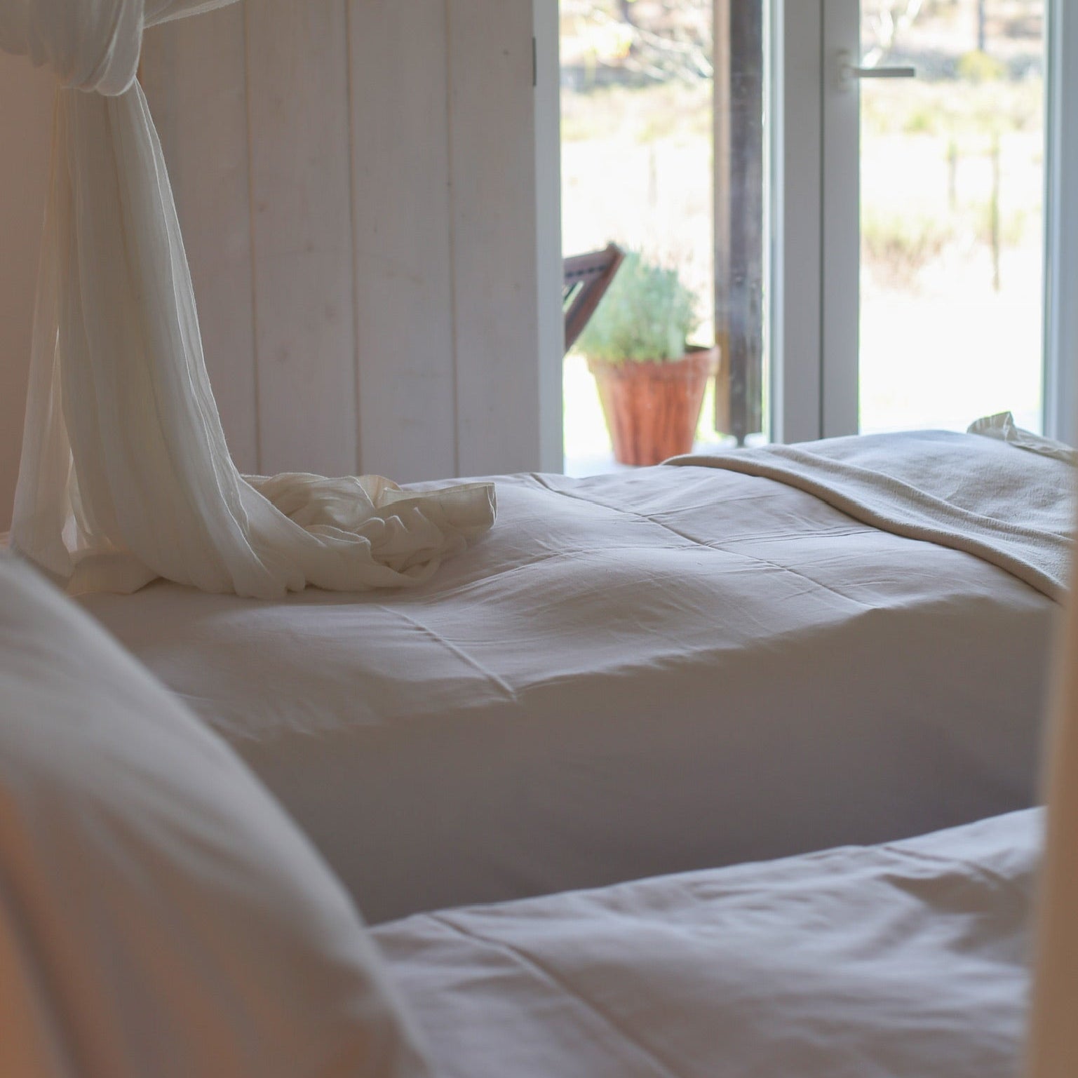 This spacious double room features two single beds that can be kept separate or joined together as a euro king, along with a private en-suite bathroom. The room opens onto quiet back terraces, offering a peaceful retreat after the day’s activities. With two double rooms available (4 spots total), this option is ideal for solo travelers, friends, or couples.